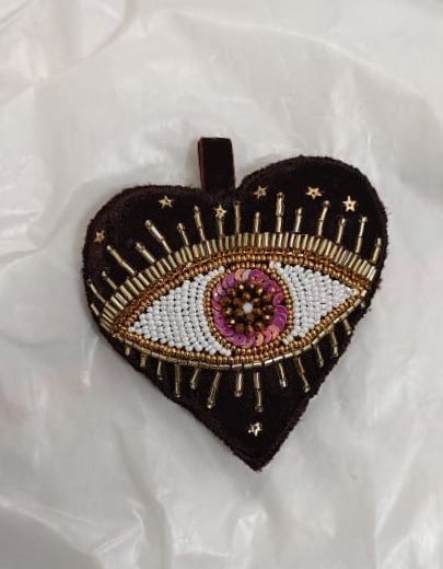 Add a touch of charm and protection to your everyday essentials with this elegant velvet key ring. Designed in a heart shape, it features intricate hand embroidery with delicate beads and an eye motif at the center, symbolizing good luck and protection. Made with soft velvet and detailed craftsmanship, this stylish key ring is perfect for keys, bags, or as a thoughtful gift. A small accessory that makes a bold statement of artistry and meaning.