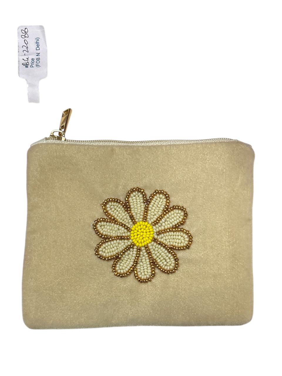 Soft velvet pouch featuring a detailed floral embroidery at the center. Lightweight, practical, and secured with a zipper—ideal for organizing essentials in style.