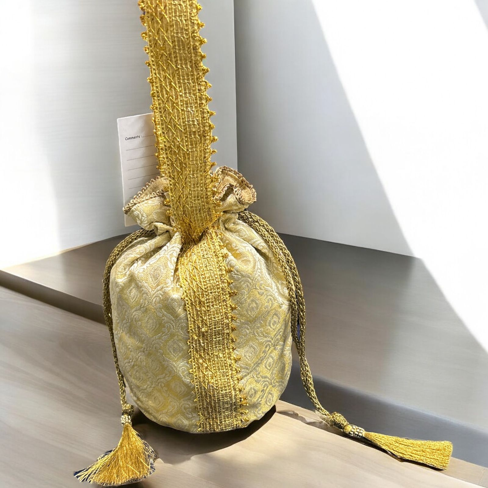 A luxurious golden potli bag crafted from rich brocade fabric with intricate woven patterns. It features a wide embroidered handle and elegant golden drawstrings ending in decorative tassels for a regal touch. Perfect for weddings, festive occasions, or gifting, this potli adds a traditional yet opulent charm to any outfit.