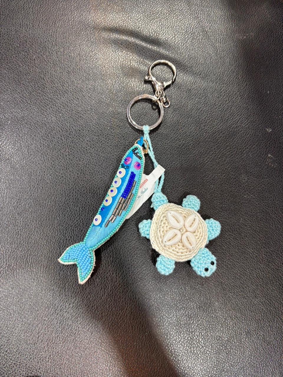 Bring a touch of the ocean to your everyday style with this handcrafted crochet key ring. Featuring a beautifully detailed fish and turtle design, this charm combines crochet work with delicate bead and shell embellishments for a unique, artisanal look. Finished with a sturdy metal ring and clasp, it’s perfect for organizing keys or adding a coastal accent to bags and backpacks. Lightweight, playful, and full of character, this crochet key ring makes a thoughtful gift for sea-life lovers and handmade accessory enthusiasts.