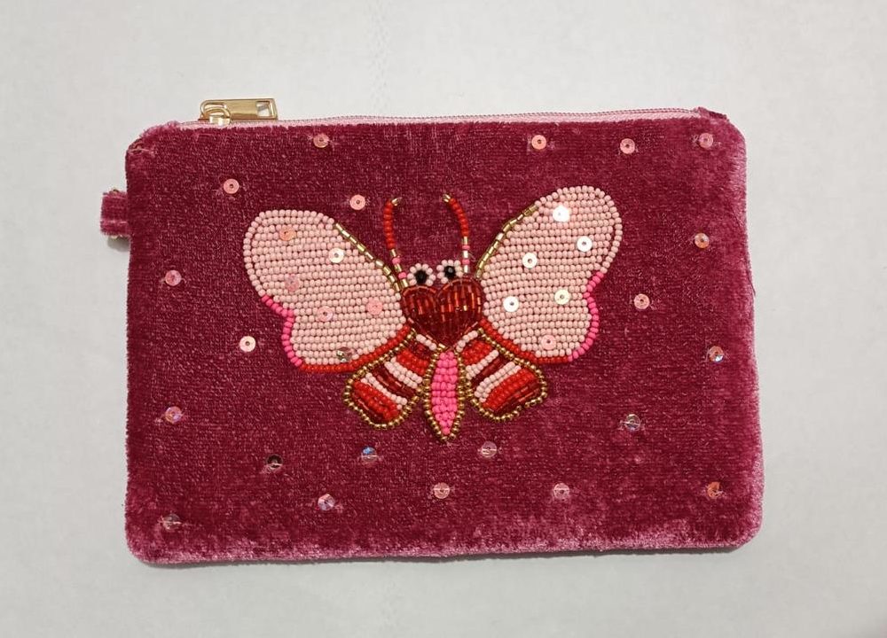This luxury velvet pouch showcases intricate butterfly embroidery crafted with beads and sequins. Rich in texture and color, it’s an eye-catching accessory perfect for special occasions or refined everyday use.
