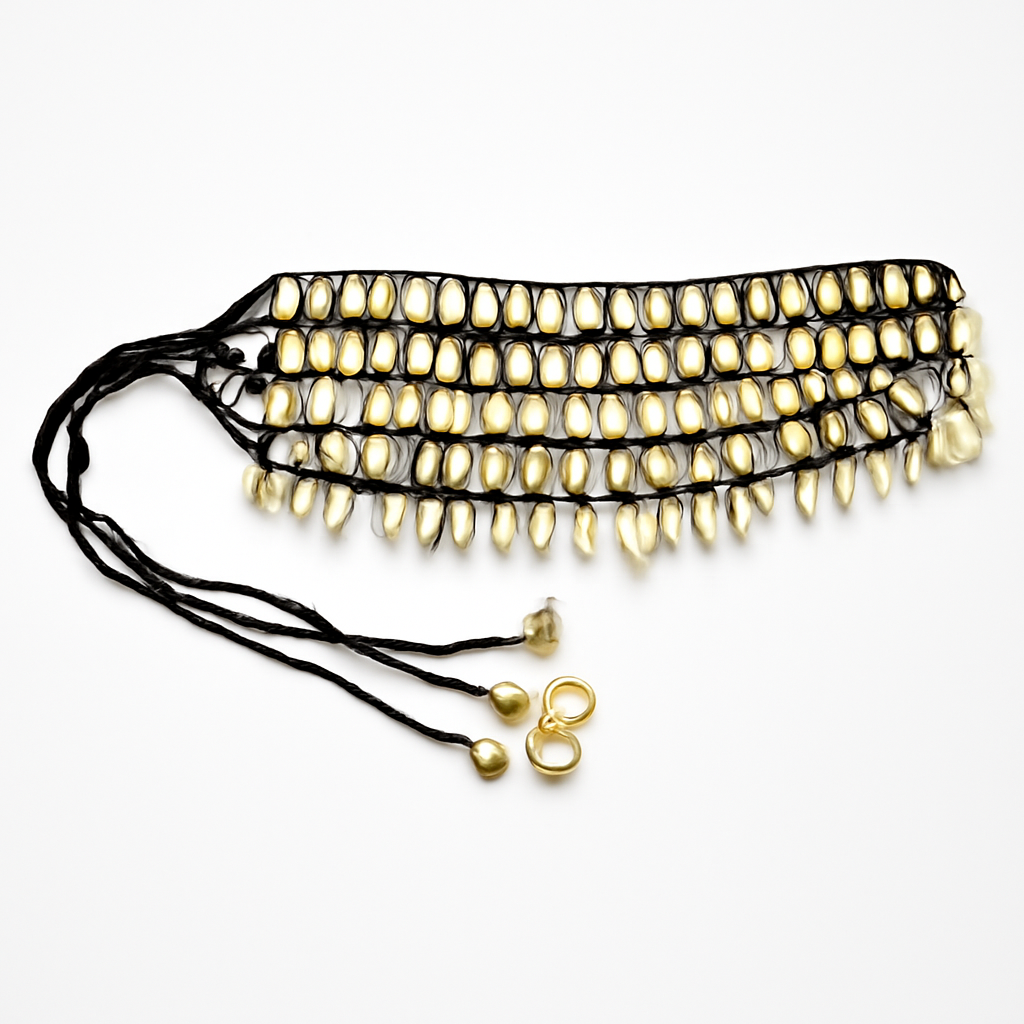 A handcrafted bohemian belt made with multiple rows of natural cowrie shells intricately woven onto black braided cords. Adjustable tie-up ends with dangling shells add extra charm and flexibility. Perfect as a beach accessory, festival wear, or to style over dresses, skirts, or casual outfits for a chic coastal vibe.