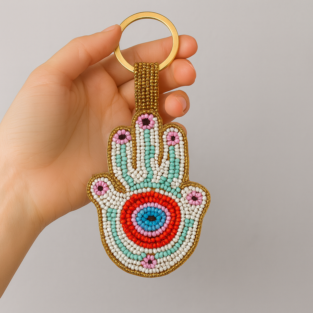 Embrace positivity and protection with this vibrant Hamsa hand keychain. Decorated with colorful beadwork and an intricate evil-eye design at the center, it symbolizes good luck and warding off negativity. A stylish, spiritual charm for your keys, bags, or daily essentials.
