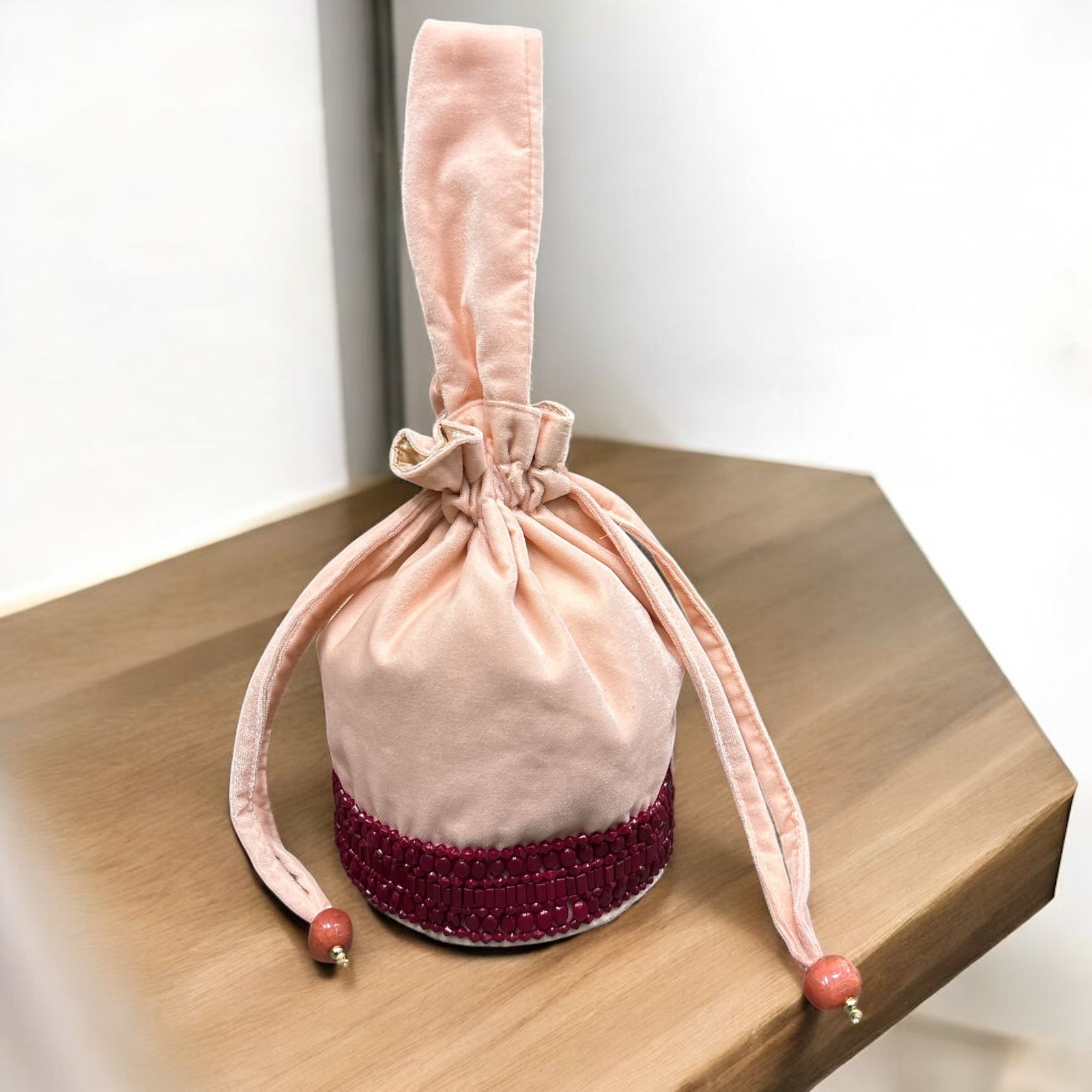 A delicate pink velvet potli bag adorned with a deep maroon beaded border at the base, adding a touch of elegance. Designed with a drawstring closure and matching fabric handles, finished with pink bead tassels for charm. Perfect for festive occasions, weddings, or evening outings, this bag beautifully blends traditional style with modern sophistication.