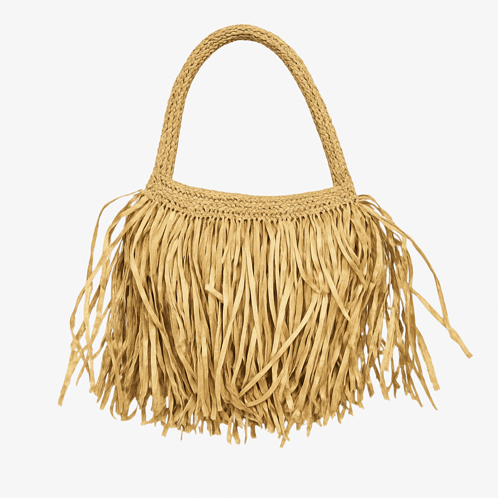 A chic and bohemian-style handbag crafted from natural raffia. Designed with a sturdy woven handle and playful cascading fringes, this bag exudes tropical charm and free-spirited elegance. Lightweight yet spacious, it’s perfect for beach outings, summer vacations, or adding a rustic flair to casual everyday looks.