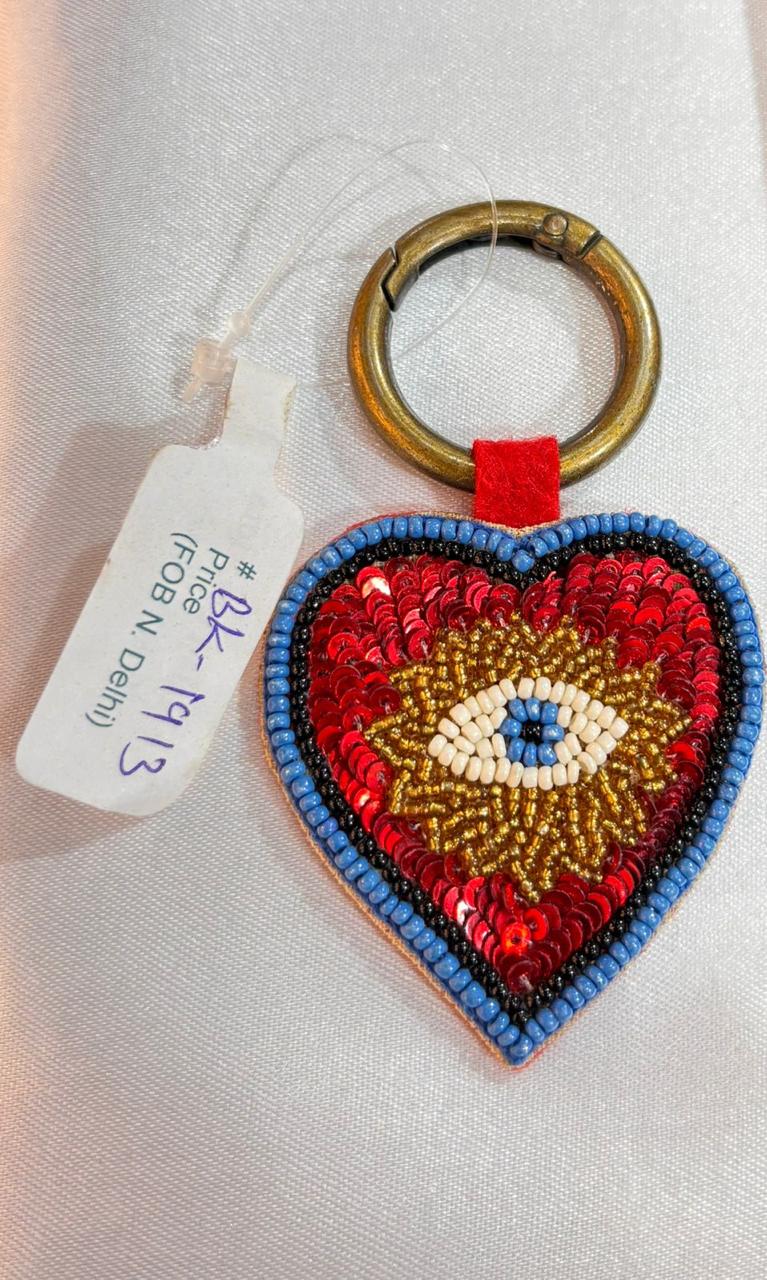 Make a bold style statement with this beautifully handcrafted velvet key ring. Designed in a striking heart shape, it features rich red sequins and intricate beadwork forming the iconic evil eye motif, symbolizing protection and positivity. Finished with a sturdy metal ring and soft velvet backing, this elegant key ring is perfect for keys, handbags, or backpacks. A unique accessory that blends traditional craftsmanship with modern charm, and an ideal gift for someone special.